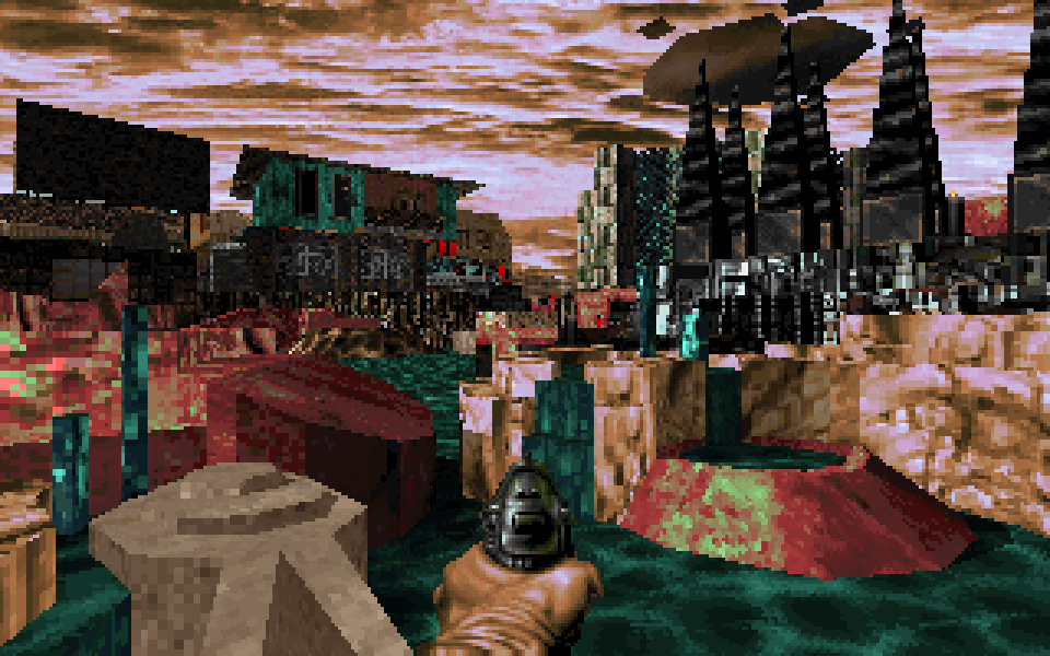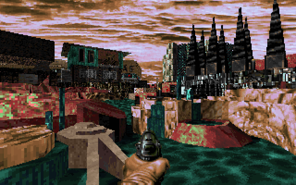 Wad file: >download<One day early this year, perhaps in February, I remembered an old idea for a setting that I never got around to realize beyond a rough MS Paint sketch. I imagined it as a black sand desert dotted with patches of weird red plants. The sky was pink and occasionally one could find oases host to civilization. These oases and settlements would have featured iridescent colors contrasting against the black desert quite heavily.